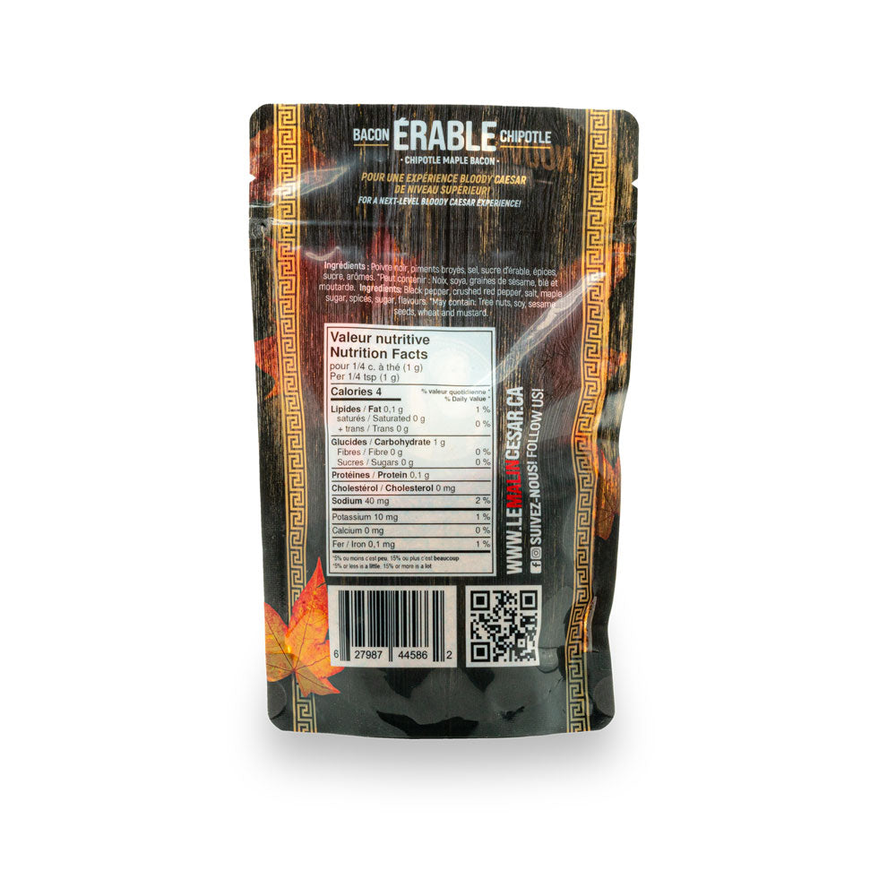 Découvrez l'épice à Bloody Caesar - Bacon Érable Chipotle : une explosion de saveurs pour vos cocktails préférés ! Arômes riches et fumés du bacon, douceur de l'érable et chaleur du chipotle. Parfait aussi en cuisine ! Commandez maintenant et savourez une expérience gustative inoubliable !